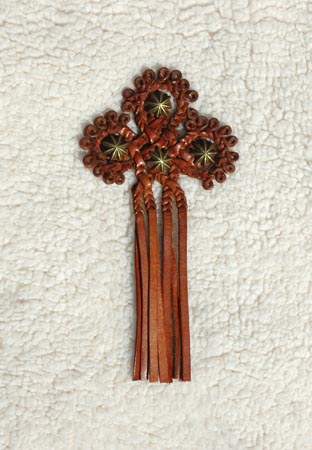 Her earrings often contrast the purple and white of quahog shells with the white of deer antler or bone. The combination gives the earrings color and textural variety, while subtly expressing the link between land and ocean. Using shell appliqué, she makes star medallions and finely-woven wide purple gauntlet cuff bracelets, both emblems of traditional Native leadership.
